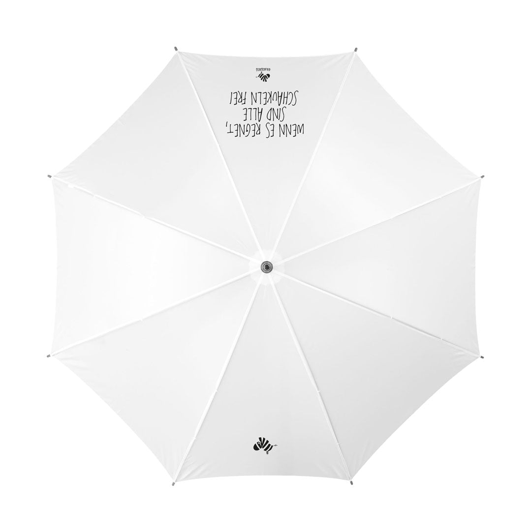 Weißer #heinzigartig Regenschirm mit dem Spruch "Frau Holle hat neuerdings Wasserbetten" und Heinz, unser #heinzigartig Maskottchen.